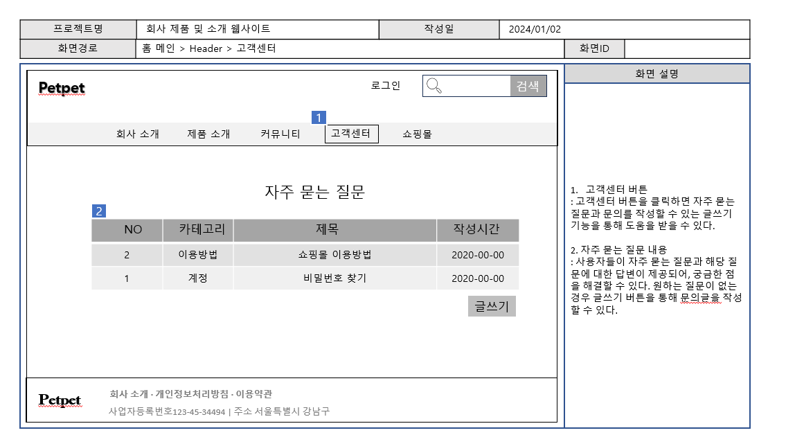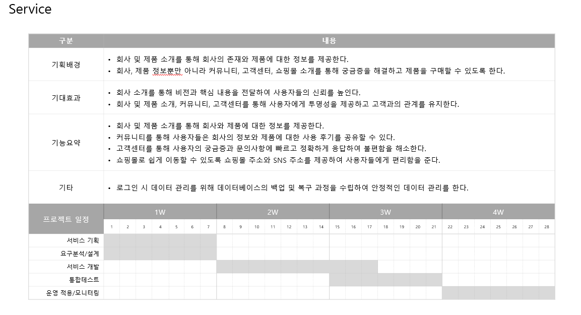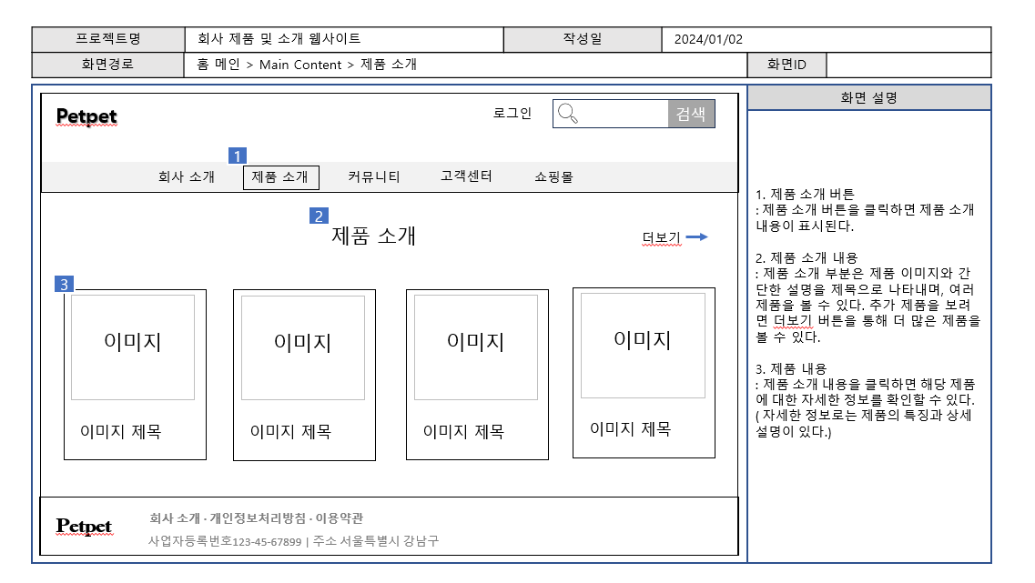 첫 번째 주에는 업무 요청자의 요구사항을 분석하고, 이를 바탕으로 기획안을 작성했습니다. 기획안은 실제 개발 시 활용할 수 있도록 작성되었으며, 특히 회사 소개와 제품을 소개할 수 있는 웹사이트의 구조와 디자인을 중점적으로 고려했습니다. 기획안을 바탕으로, 웹 페이지 개발이 원활하게 진행될 수 있도록 필요한 요소들을 시각적으로 표현하고, 각 기능이 어떻게 구현될지 구체적으로 명시했습니다.